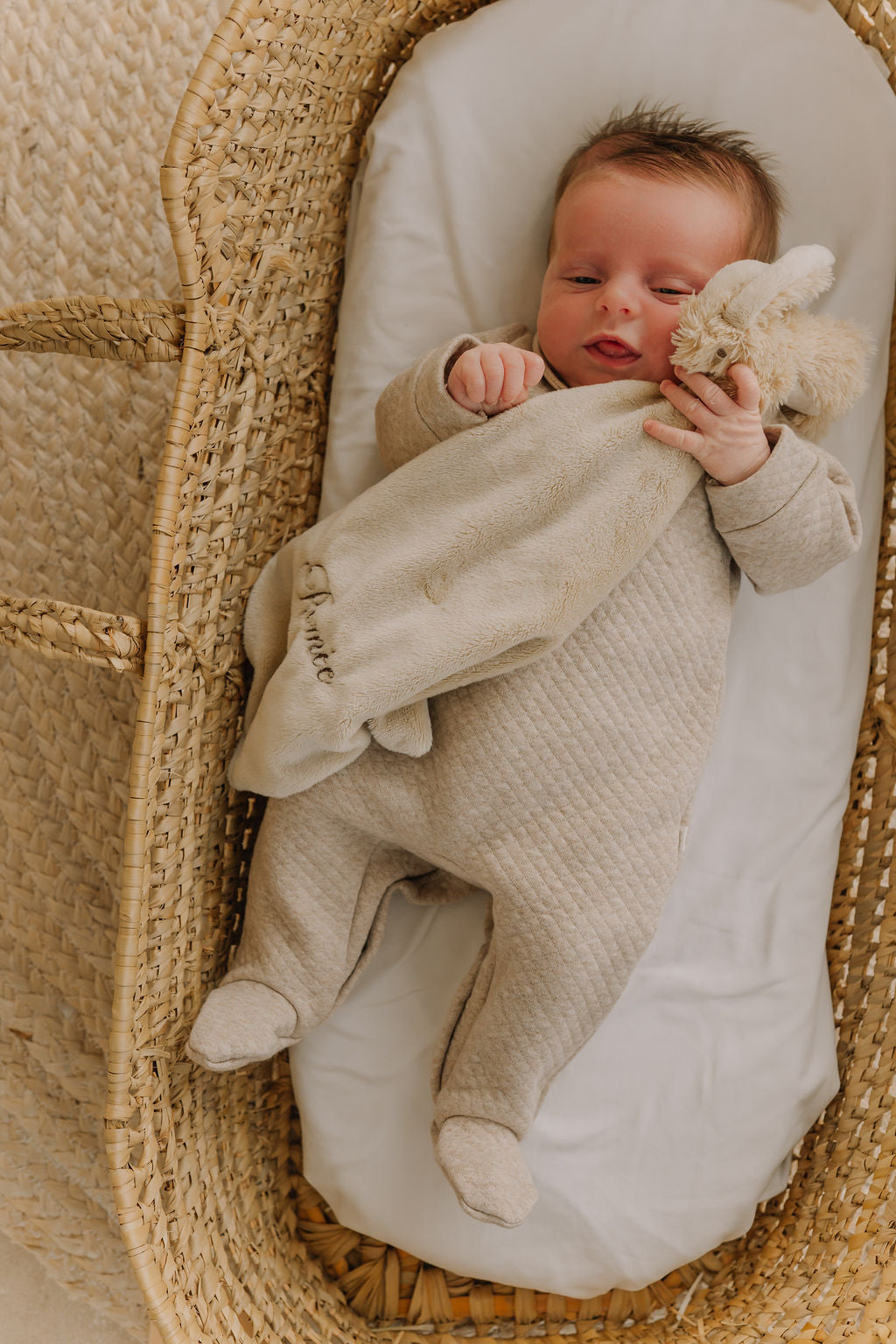 Verkrijgbaar in twee tijdloze kleuren – zand of wit – en afgewerkt met een prachtige, minimalistische borduring. Laat het personaliseren met een naam voor een uniek, liefdevol detail 🧵.