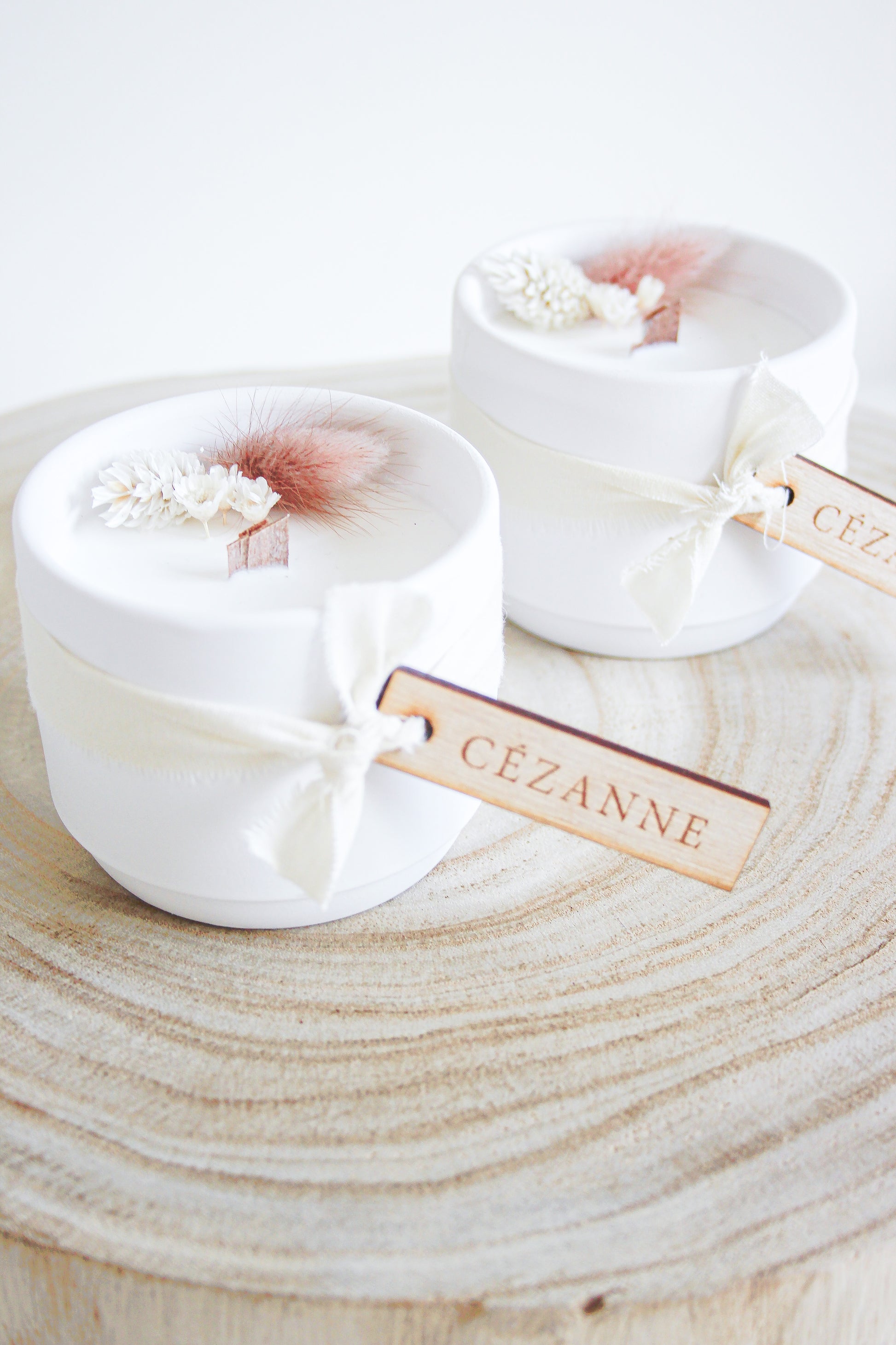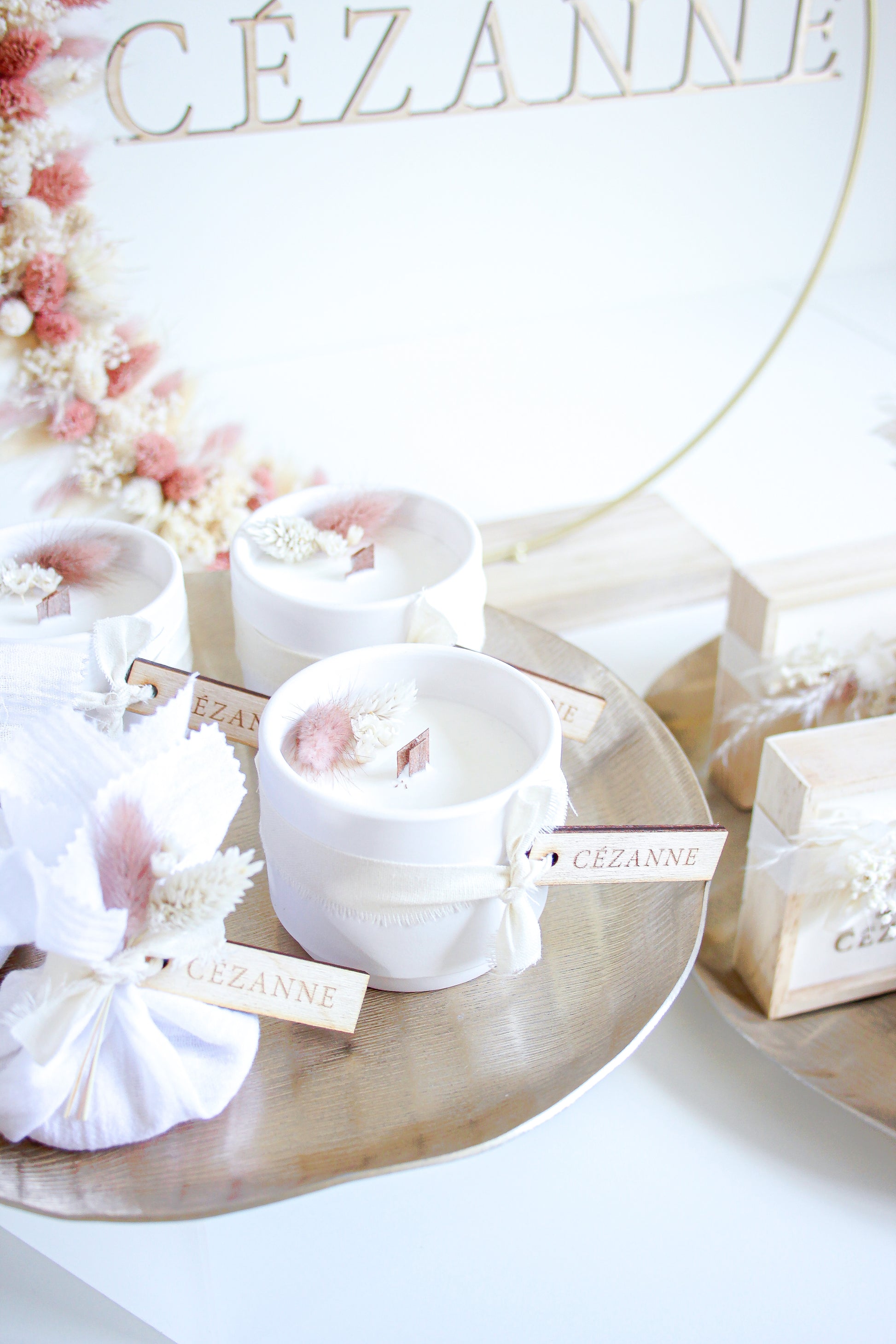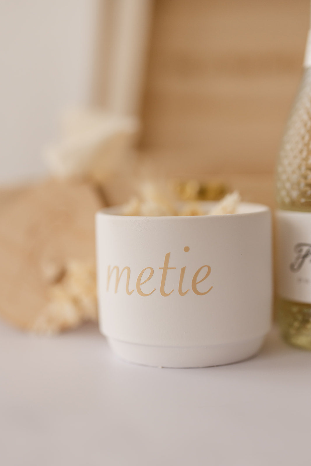 "Kleine, verfijnde kaarsjes in een wit keramieken potje met een houten lont, ideaal als geschenkje. Ze zijn leuk om te geven, kunnen gepersonaliseerd worden en zijn stijlvol afgewerkt met droogbloempjes. Klein maar fijn!"