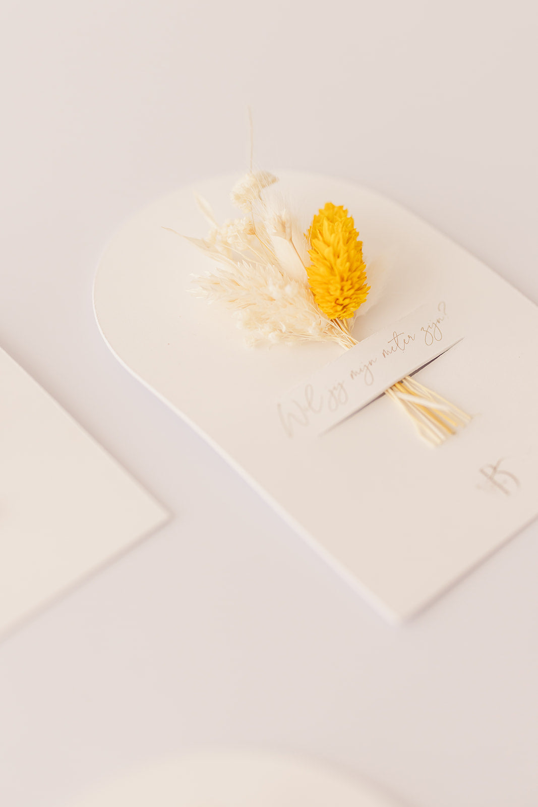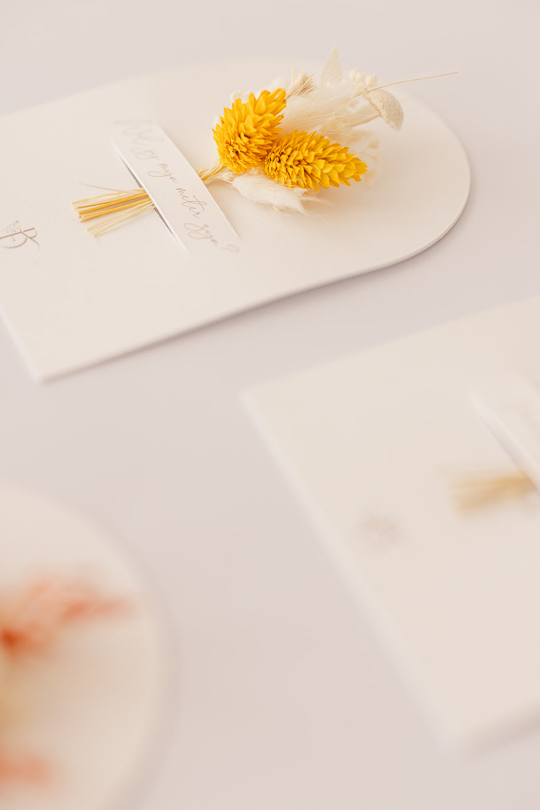 Deze kaartjes gesneden uit stevig papier met halve boog en droogbloempjes is ideaal om uw speciaal verzoek over te brengen.