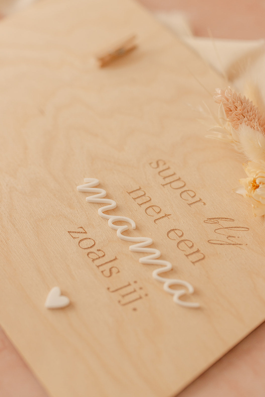 Een uniek detail is het woord " mama '' die als 3D effect in acryl op het bordje werd bevestigd.