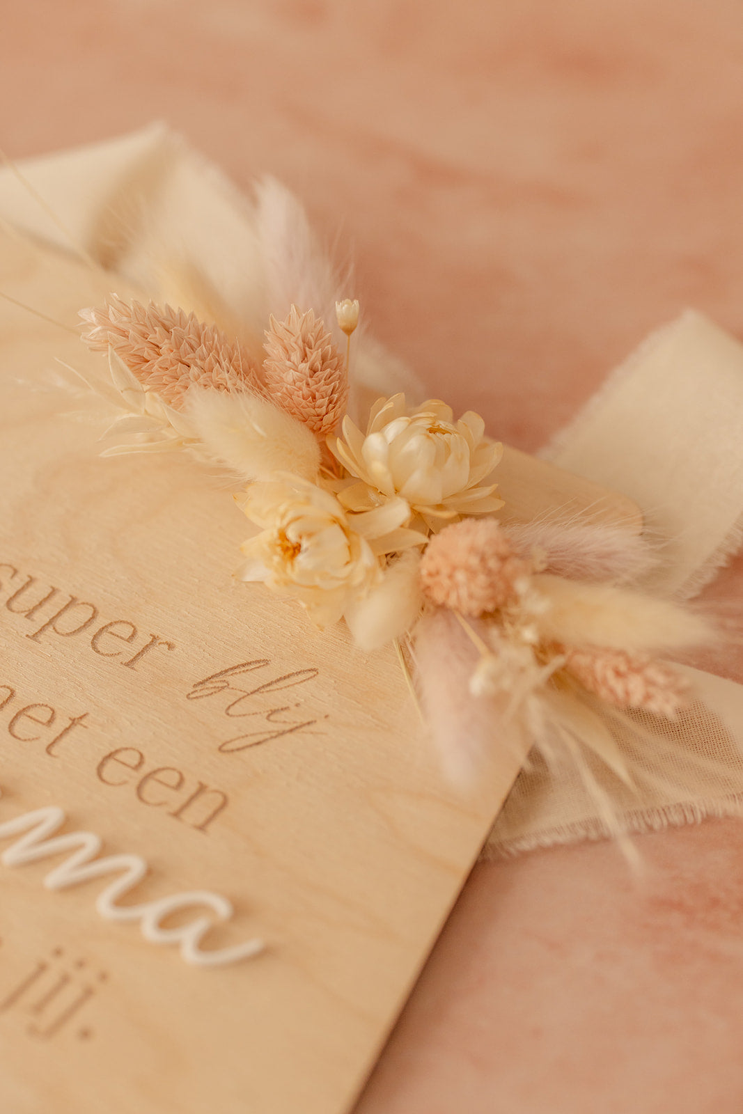 Het fotobord wordt afgewerkt met prachtige bosjes droogbloemen en kan rechtgezet worden met het bijgeleverd houten voetje.