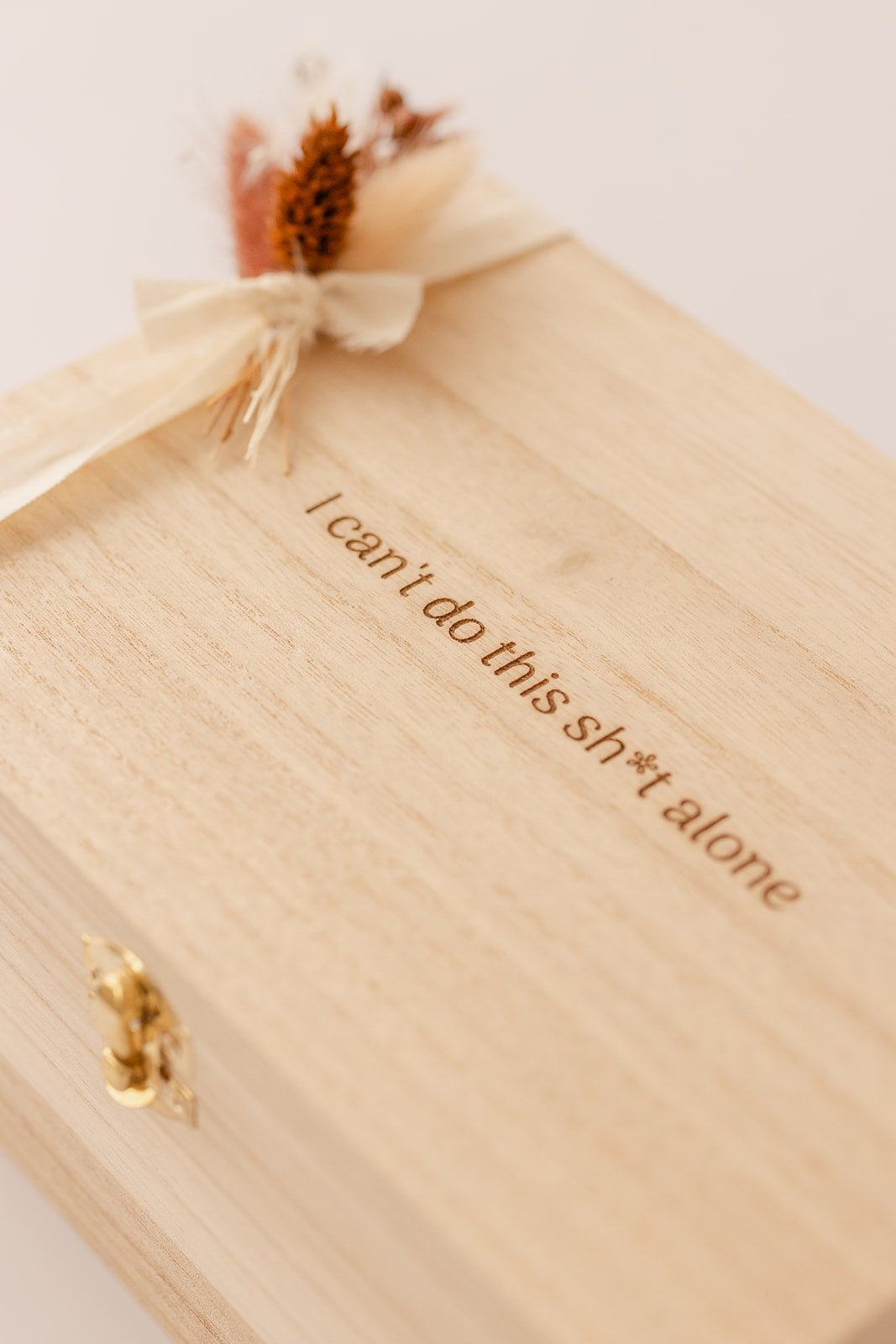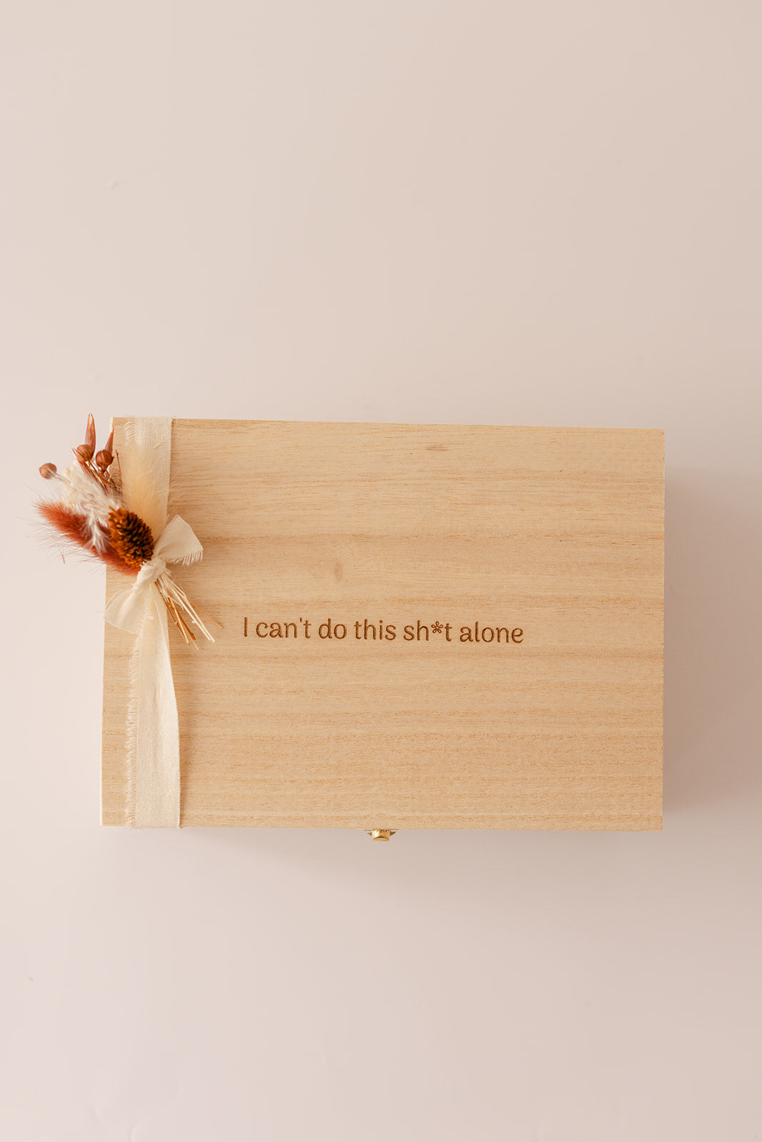 Geschenkdoos met vast ontwerp '' I can't do this shit alone '' aan de buitenkant en " wil jij mijn peter zijn" aan de binnenzijde van de doos.