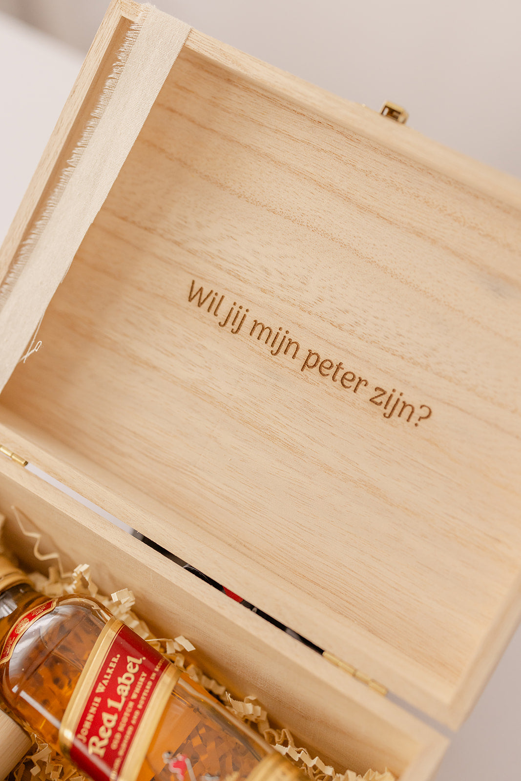 De inhoudt van de kist is LEEG! U hebt de volledige creatieve vrijheid om de kist zelf op te vullen met iets leuks! Perfect om uw getuige of peter te vragen op een originele, ludieke manier!